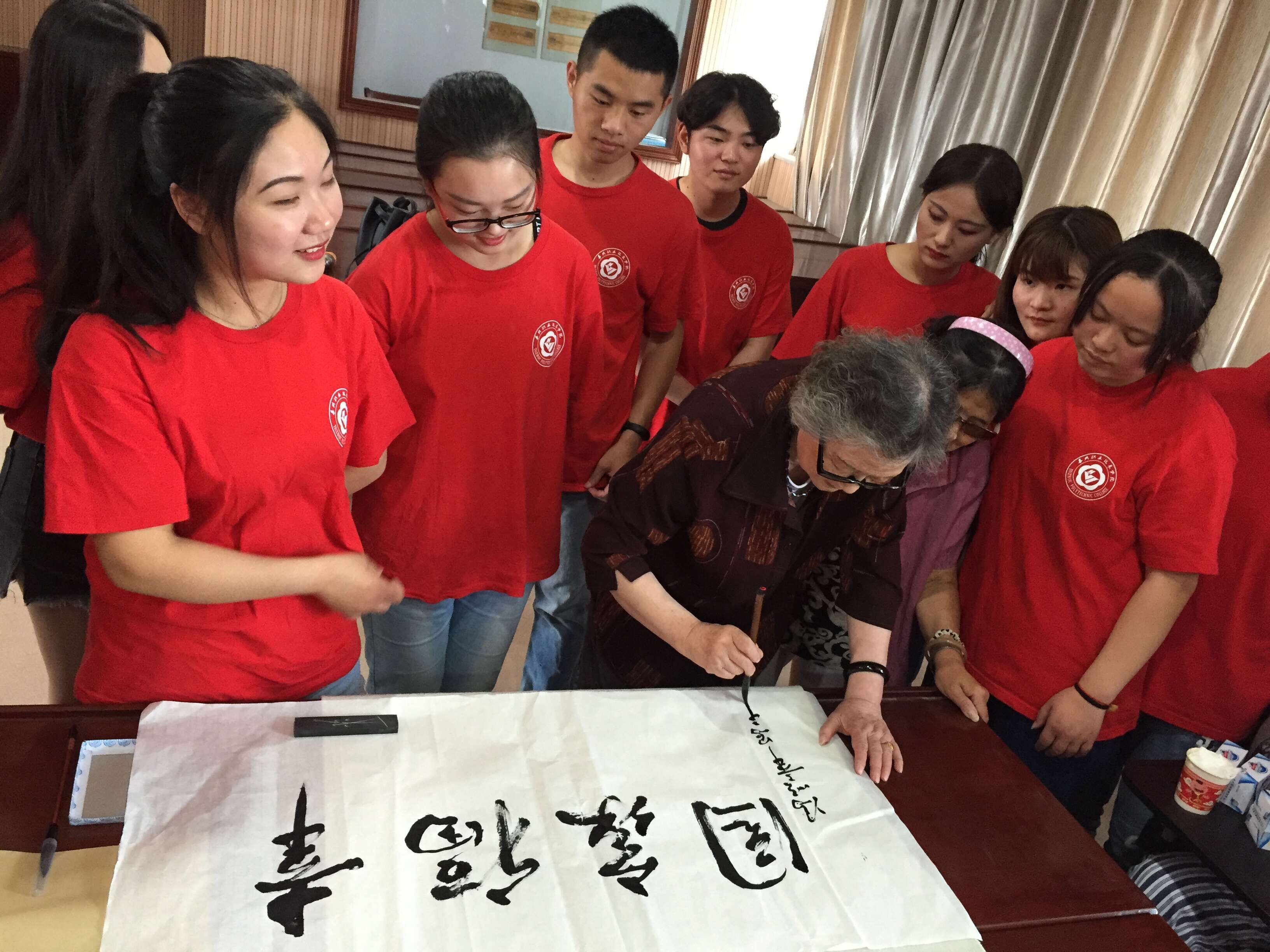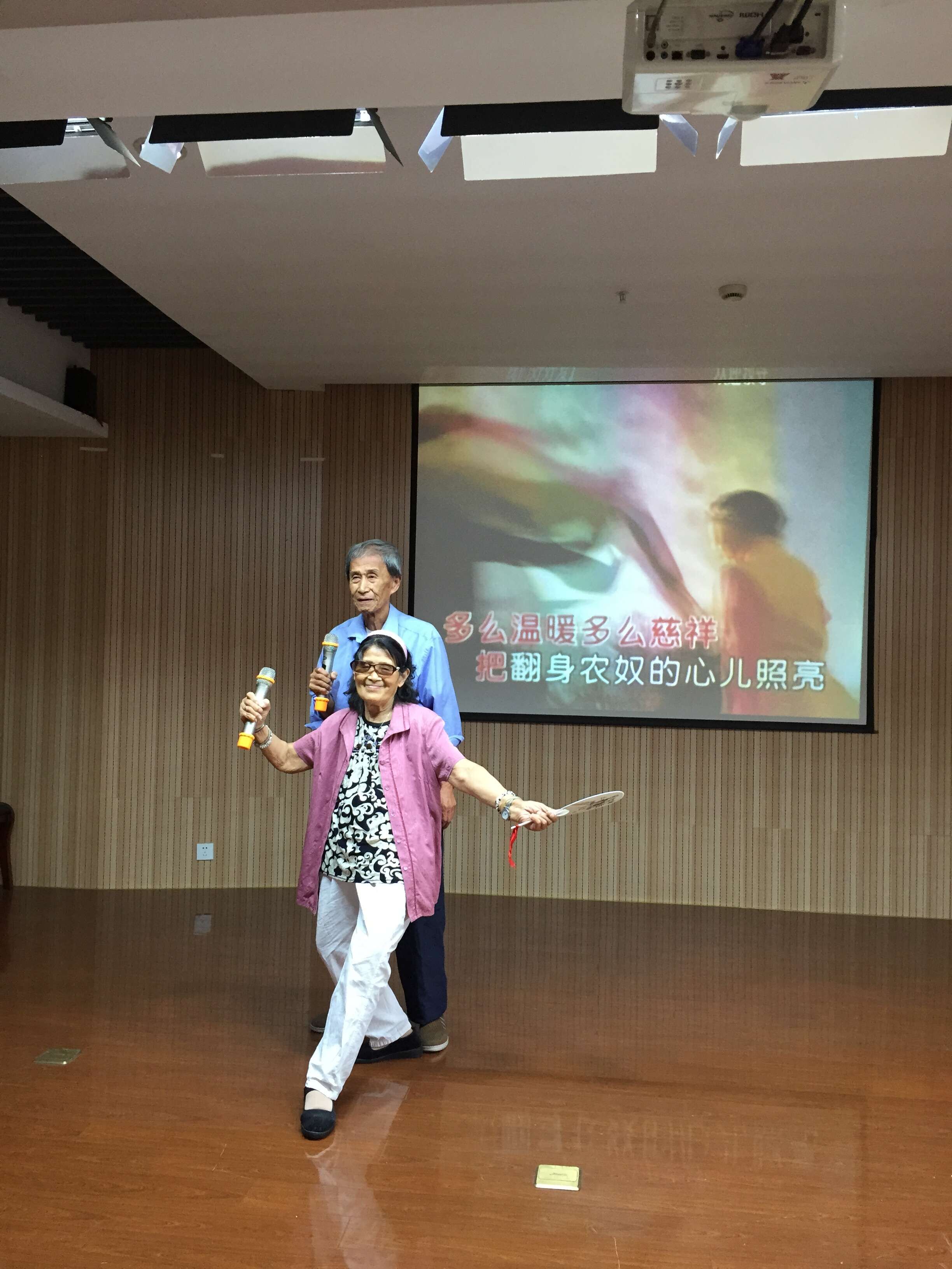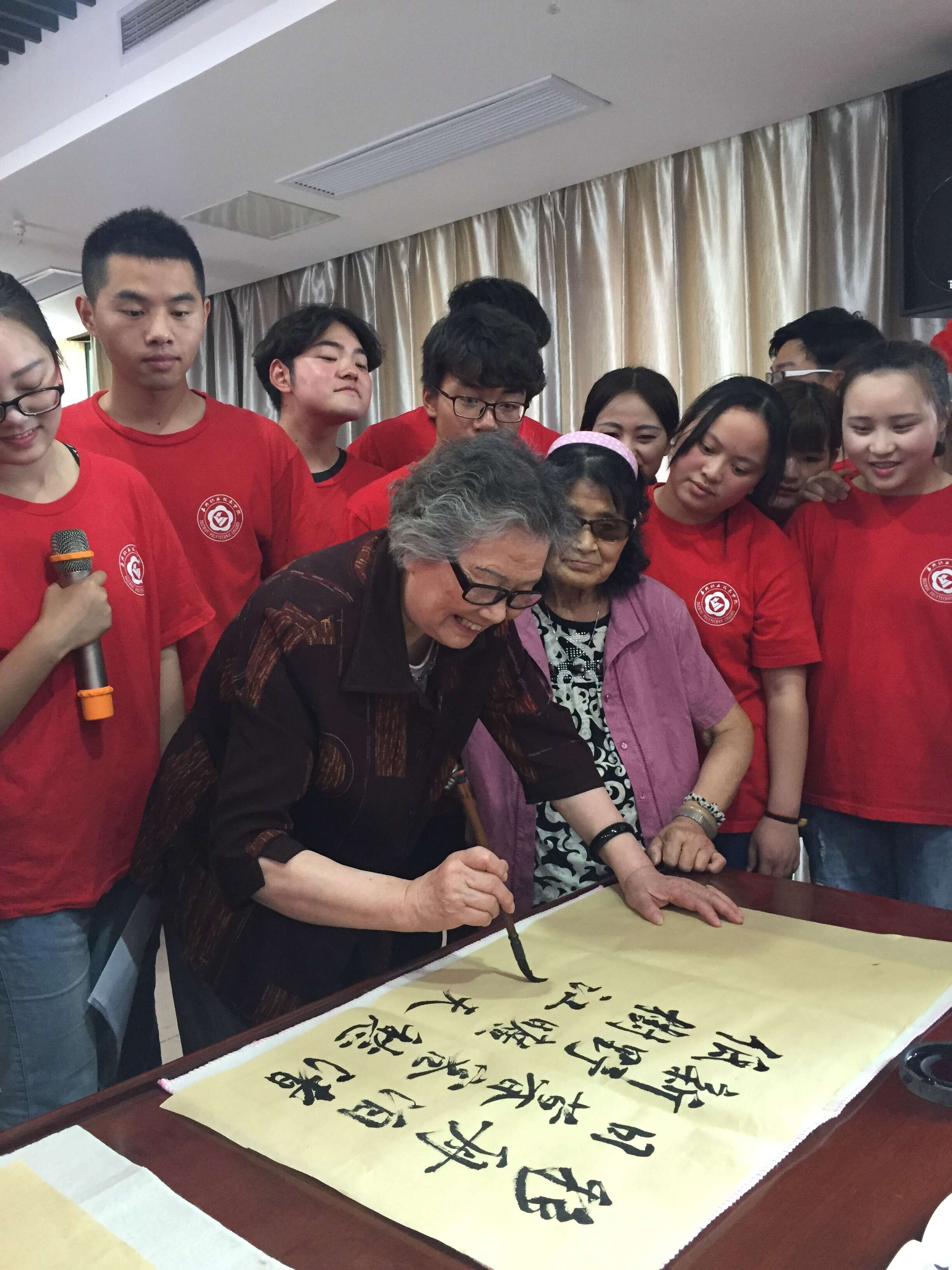 上午九点,全体参与人员准时到福利院,爷爷奶奶们也早早的坐在会议室里等待着我们的到来。演出的整个过程气氛活跃,有古筝独奏、笛子独奏、合唱、萨克斯等,同学们用真诚的行动换来了在座的笑声和掌声,为老人们平淡的世界里带去了歌声和欢乐,也带去了问候和关怀,老人们脸上都露出了欣慰的笑容;快看!一首《甜蜜蜜》让爷爷奶奶仿佛记起了年轻时的爱情和美好,纷纷争着要合影,并挽起了自己老伴的手,那画面真的很美好,跟蜜一样甜!瞧!一位时髦的老奶奶,挽着老伴的手,脸上流露出甜美的笑容,从她笑容中就可以看出她在这里过的无比安逸和幸福。再看,这位自带慈祥温暖的老奶奶,她的笑容很有磁性,让人有种不由自主的想要跟她亲近的感觉,她的手一直拉着坐在轮椅上老伴的手,脸上总是留有亲和的笑容;在互动环节,福利院的爷爷奶奶也即兴演唱了一首《北京的金山上》,真是鹤发童颜,童心未泯,老少同乐,时髦的奶奶用自己“专业”的舞姿和豪迈歌声,逗得大家从心底里感到开心温暖。看到这些老人让我觉得生命的两端都是小孩,看到老人排排坐,同学们带着老人唱歌做游戏,老人们笑着、唱着、拍着手、跳着舞,天真无邪的样子,似乎让我看到的是一张张回到孩童状态的小朋友的笑脸,希望她们一直像孩童一样天真快乐地生活着。面目慈祥的冯奶奶也为我们展示了她的书法,冯奶奶的字,如花瓣般,香气远播,越发清芬,举笔信手涂抹几下,一幅腾飞的巨龙即跃然纸上,真是字如其人,身边观看的同学们赞叹不已!最后分别时大家一起合影留念并派送纪念品让氛围愈加温暖起来。在持续一个多小时的慰问活动中,在场的师生们用自己的热情为老人和孩子们送去了心灵的慰藉。
