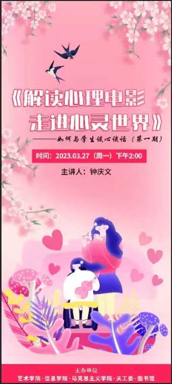 3月27日,艺术院、信息院、马院、关工委、图书馆在图书馆四楼多媒体会议室联合举办了“解读心理电影 走进心灵世界——如何与学生谈心谈话)”心理沙龙第一期。本系列沙龙由马克思主义学院钟庆文老师主讲。