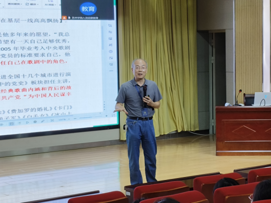 钟庆文教授以艺术学子心向党:用专业技能谱写青春信仰为主题,从我们为什么入党”“入党有哪些条件与要求”“如何实践入党目标三个方面展开讲解。在我们为什么入党部分,钟教授强调入党是将个人艺术追求与国家和人民需要相结合的崇高选择。他通过分享中央歌剧院男高音歌唱家李想的故事,说明艺术表演不仅是技巧的展示,更是思想与情感的传达,能够传递力量、鼓舞人心。同时,他还结合音乐表演、数字媒体艺术设计婴幼儿托育服务与管理、舞蹈编导广告艺术设计等不同专业,阐述了各专业与党的宗旨的契合点,引导同学们从小我走向大我。对于入党有哪些条件与要求,钟教授详细解读了入党的基本条件和成长路径,他表示,入党有严格的标准和程序,这不仅是一次组织的筛选,更是一次自我的成长和淬炼。他还通过举手问答的互动环节,让同学们对入党条件有了更清晰的认识。在如何实践入党目标方面,钟教授鼓励同学们用专业特长服务社会,将入党的过程融入日常的学习和生活中。他提出,同学们要主动学习党的理论,积极参与志愿服务、社会实践等活动,在思想和行动上同时向党组织靠拢。此外钟教授还设置了红色旋律猜猜猜”“主旋律短视频创意策划”“爱心情景剧等多个互动环节,让同学们更加深入地参与到活动中,切实体会艺术与信仰的紧密联系。