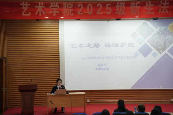 为强化新生法治观念,护航大学生涯健康成长,2025年10月24日,艺术学院特邀泰州市检察机关退休干部薛利民女士2025级全体新生带来法治教育专题讲座。讲座紧扣艺术专业特色与青年成长需求,以详实案例与实用知识,为新生送上一堂生动的“法治启蒙课”。